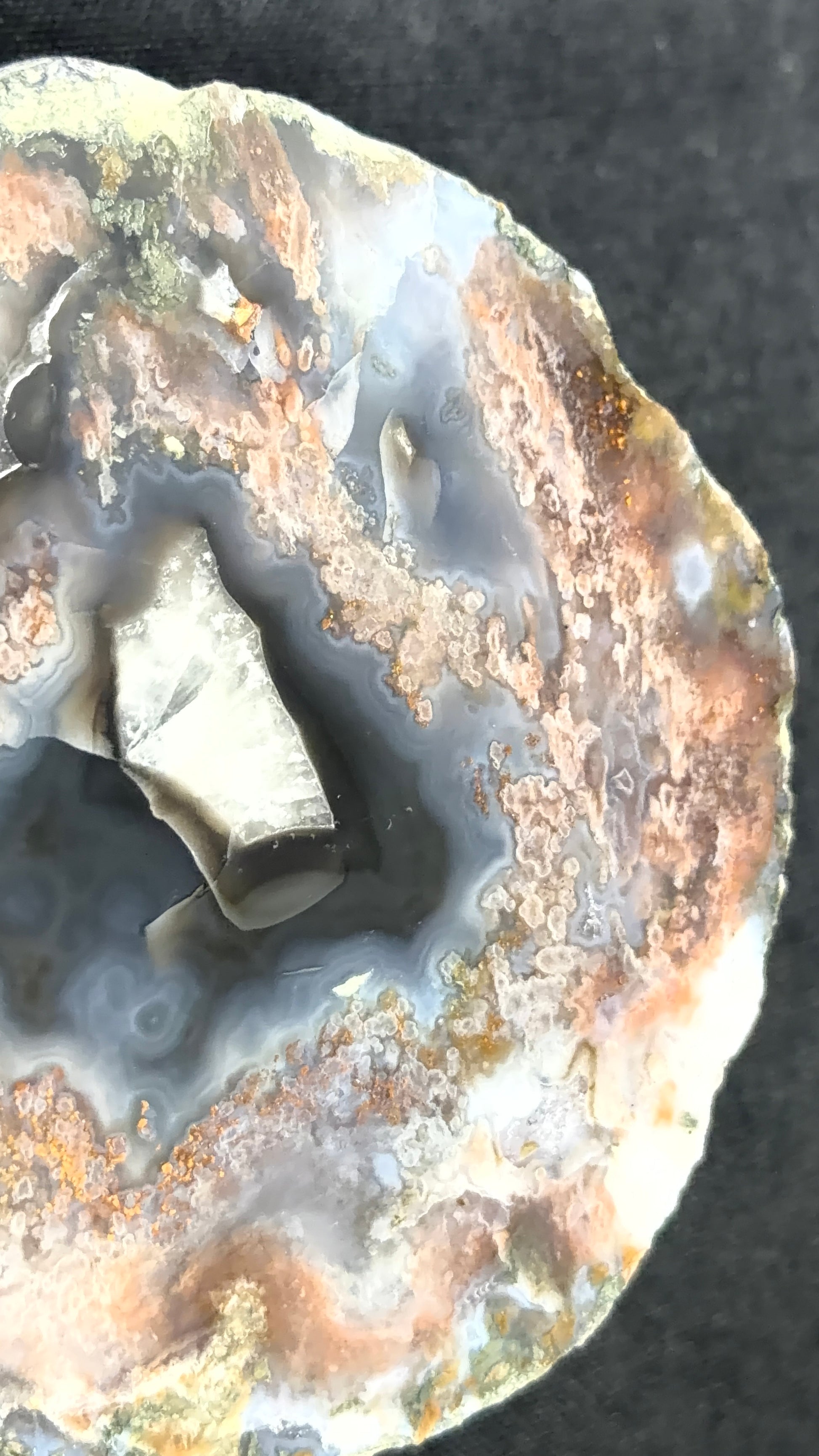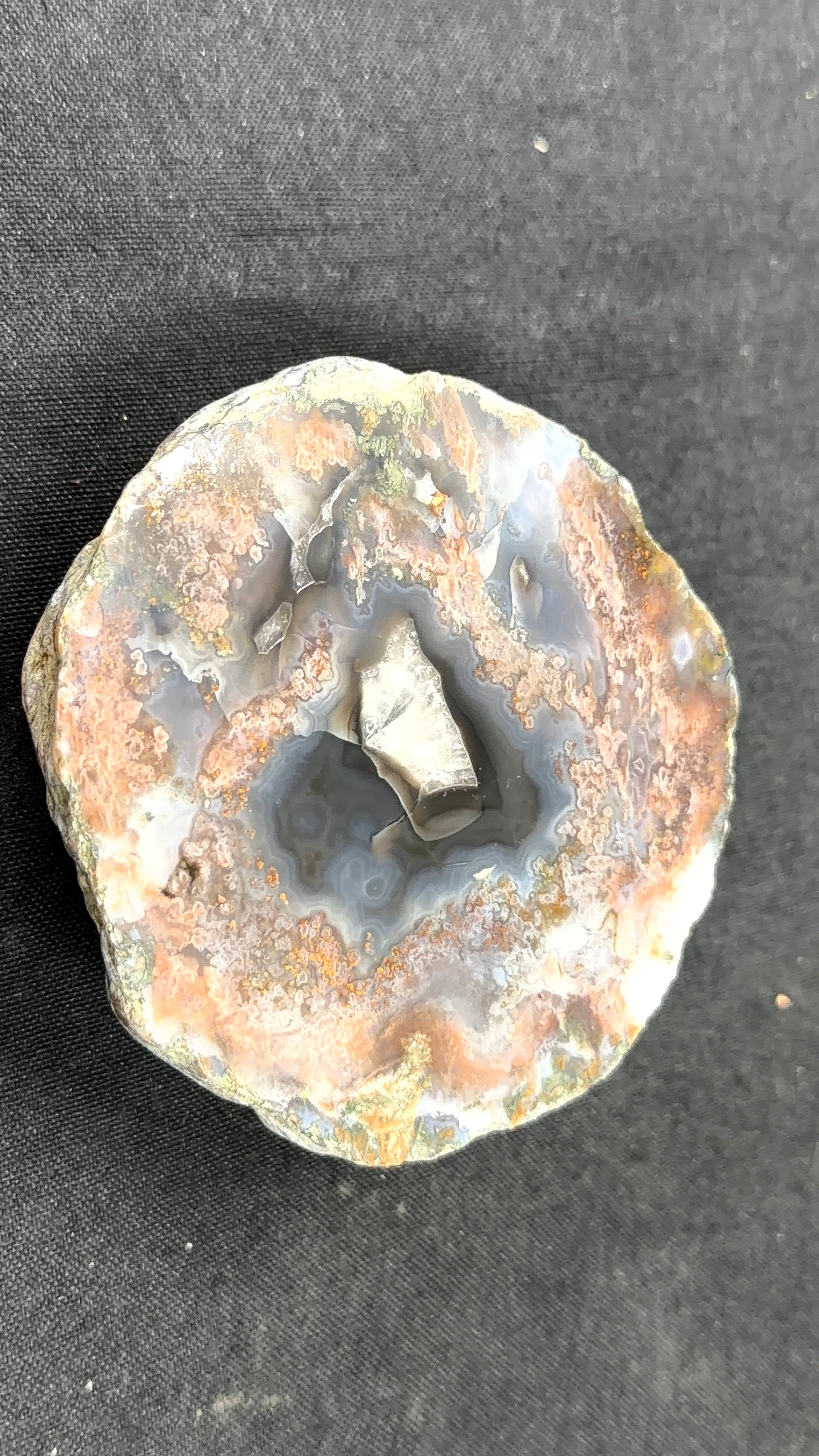 Gorgeous midnight series Kentucky Agate with black bands and a calcite center. Featuring some reddish moss agate.