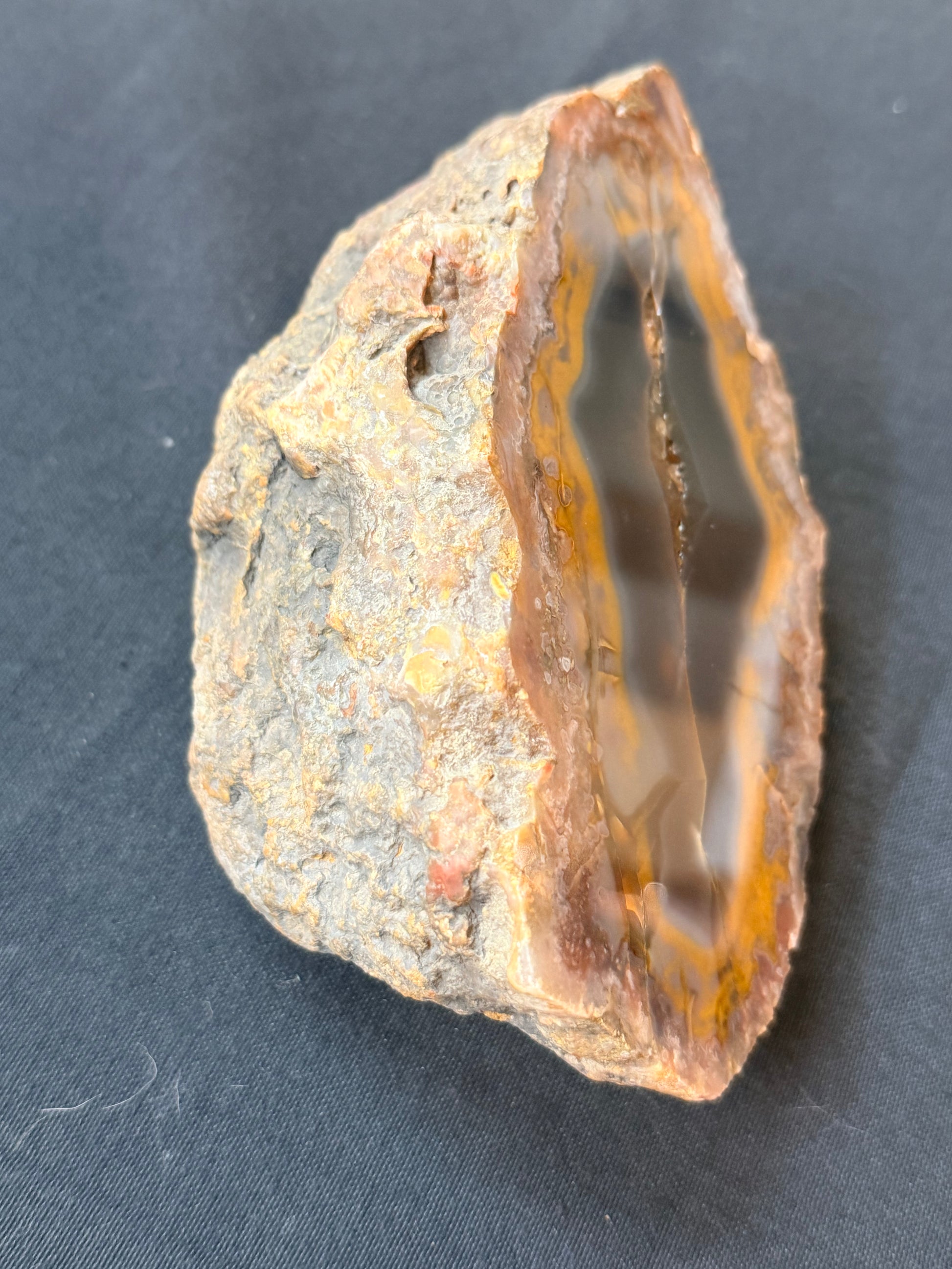 Black gray and yellow Kentucky agate polished specimen with a smoky quartz center. Plenty of small eyeballs and some interesting pinks on the edge of the yellow