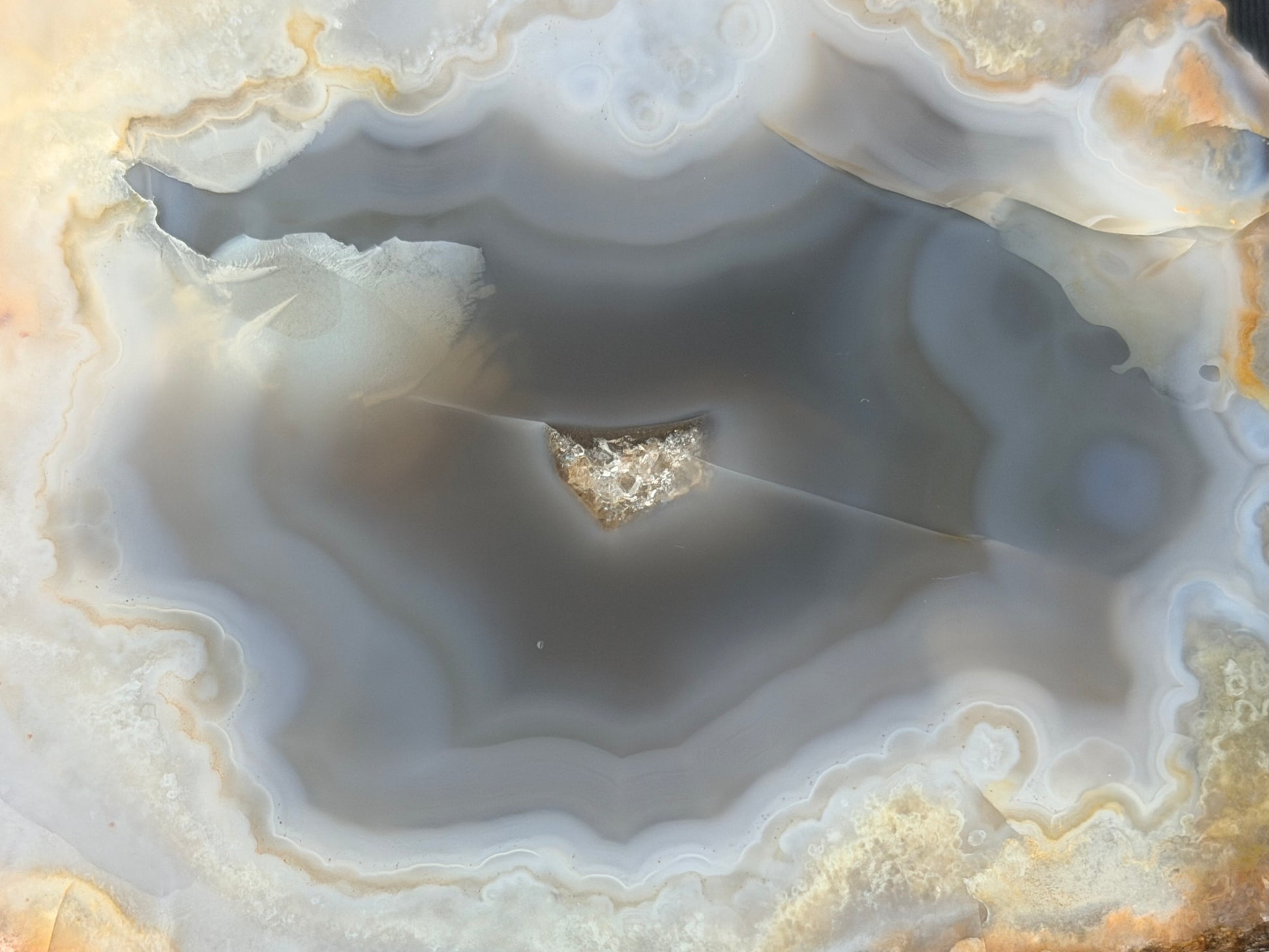 Midnight series Kentucky agate with a large face and great pattern. The center is quartz :) polished specimen