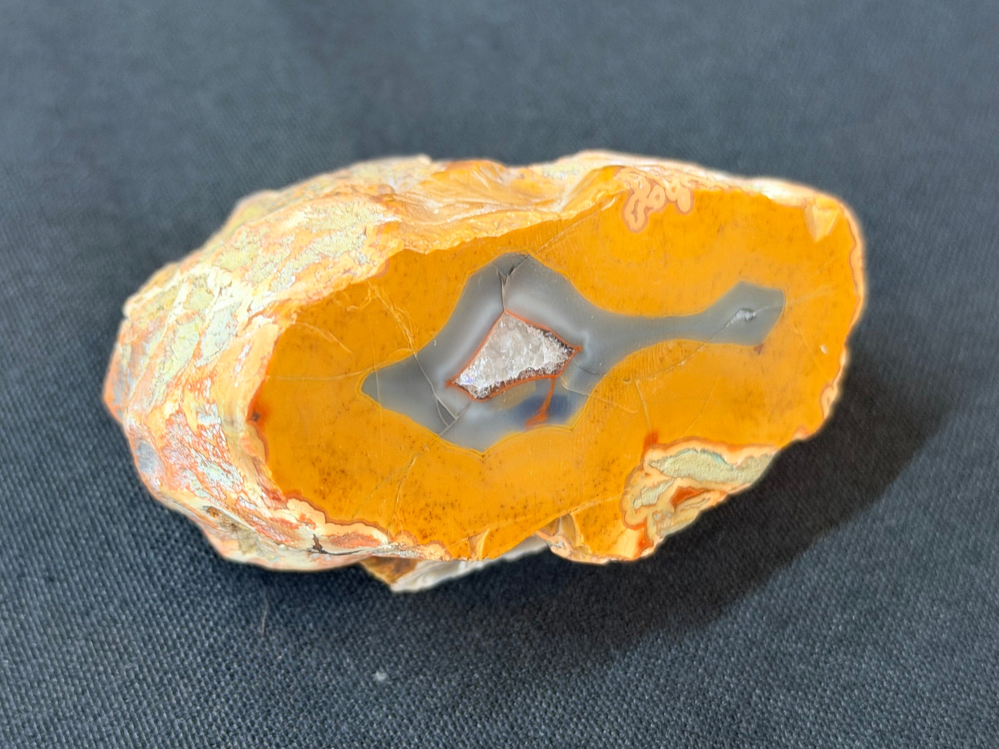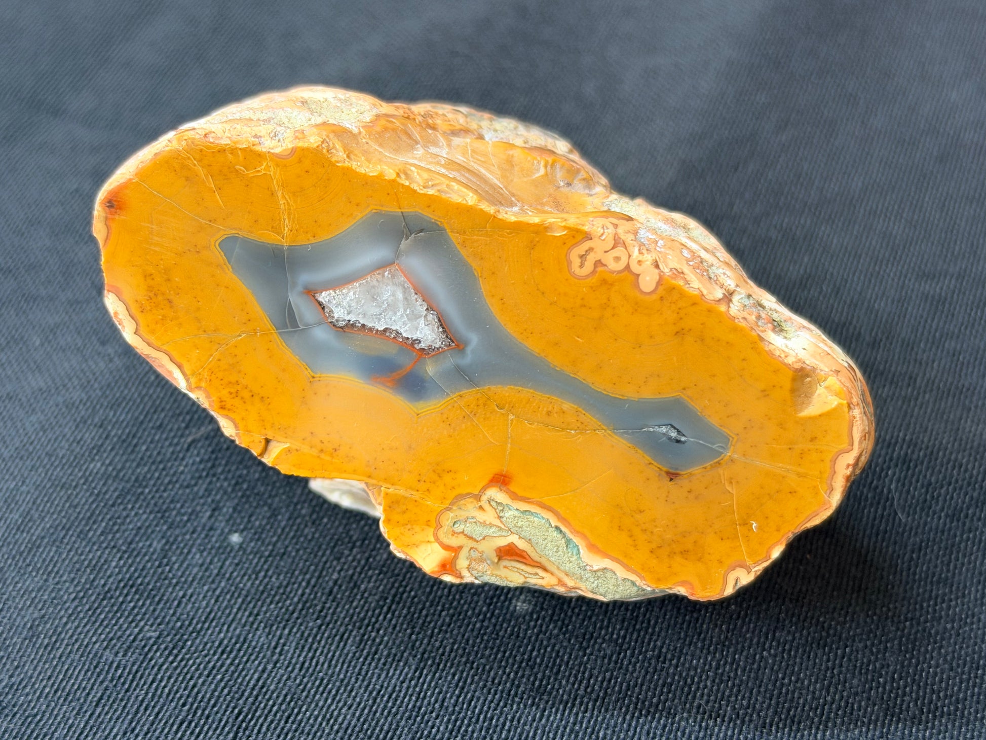 What a strange one. The yellow bands are full of little red dots! Pointillism at its finest :) this polished Kentucky Agate has a calcite and smoky quartz center surrounded by gorgeous yellow and bluish bands