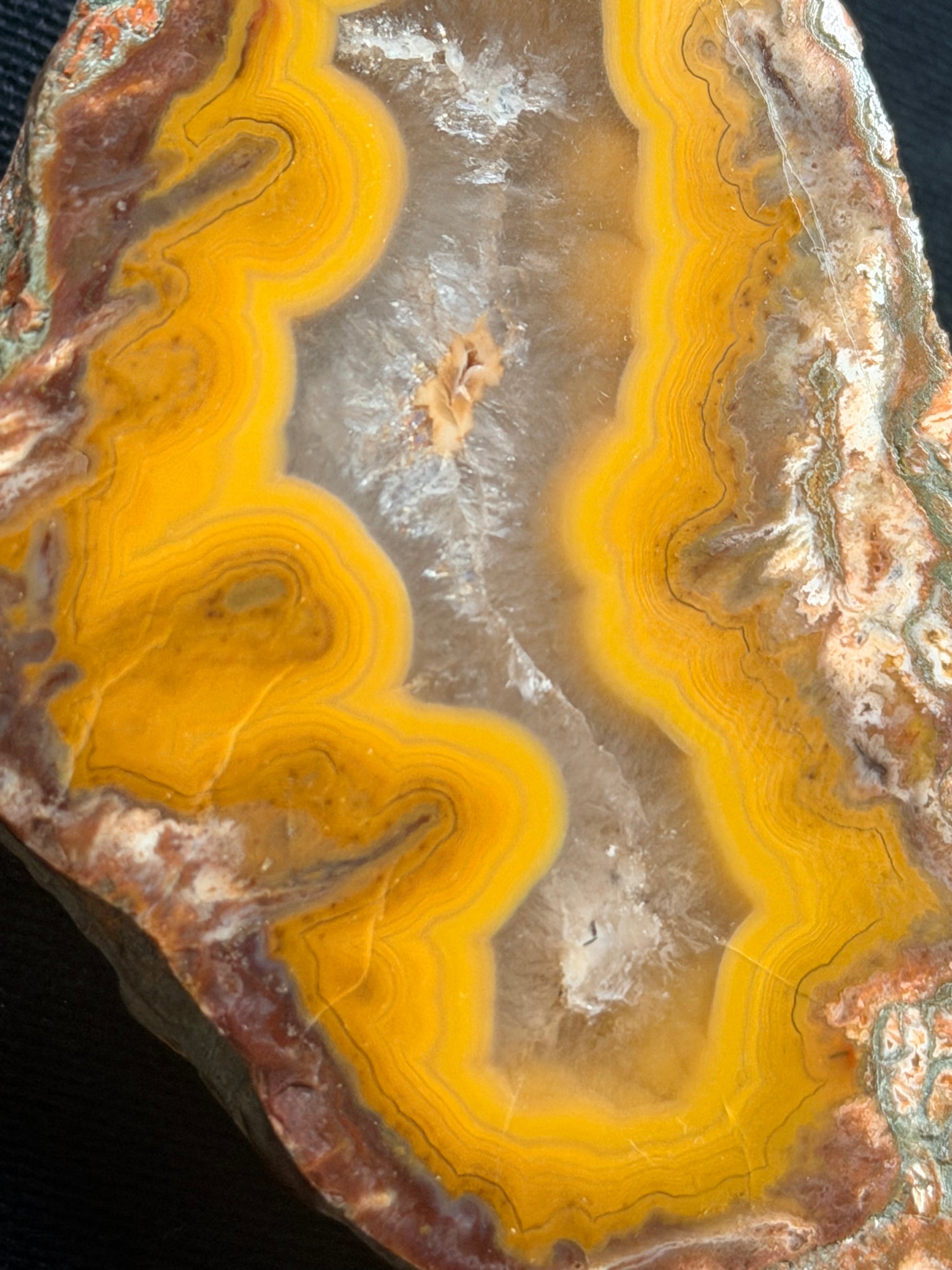 Multiple nodules adorn this specimen. The polished Kentucky agate has two of the nodules cut to show the brilliance of the interior. Tight yellow bands dance around a feathered quartz center.