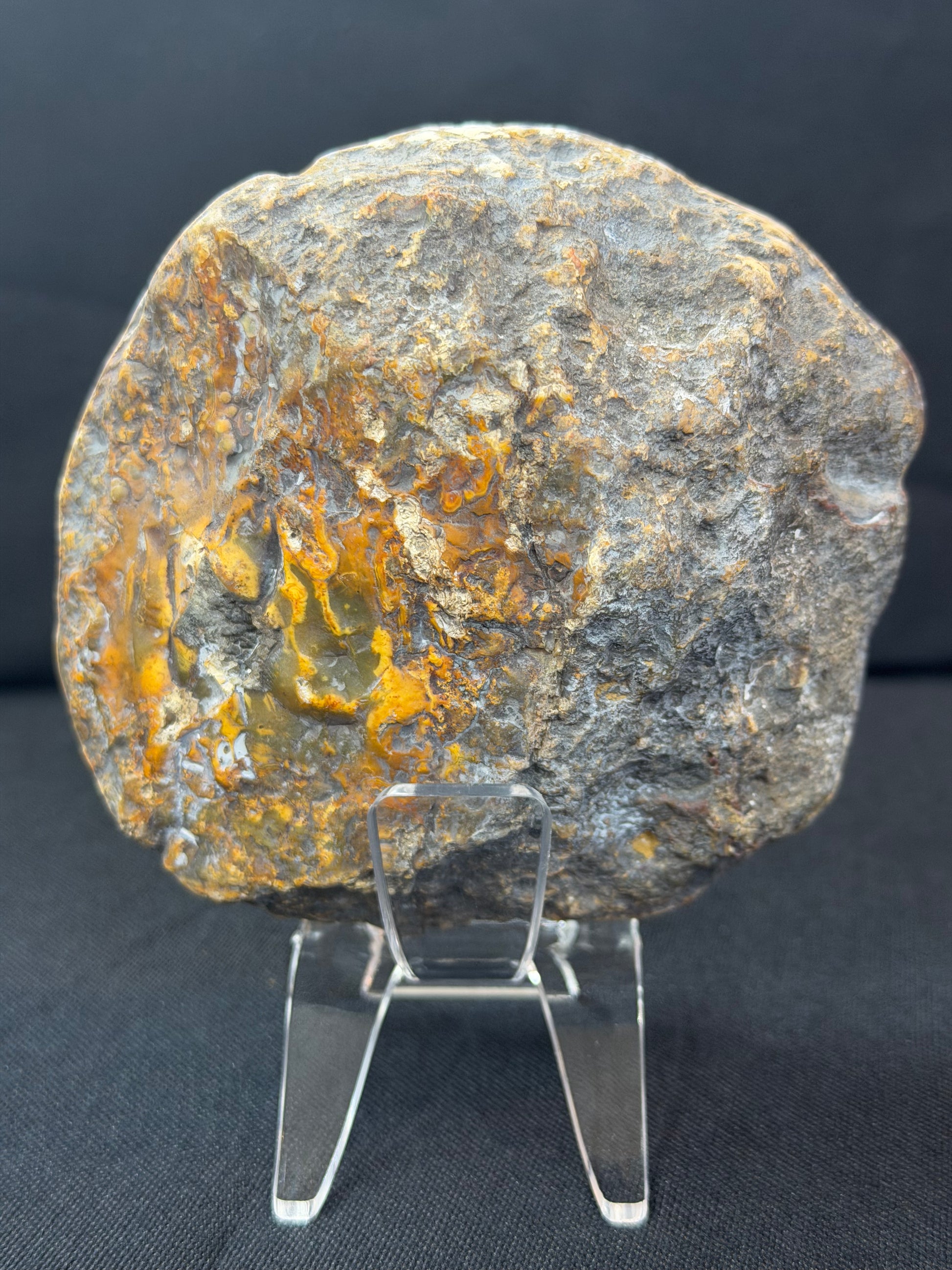 This yellow banded agate is gathering its power back from the matrix to hold its beautiful red belly in place.