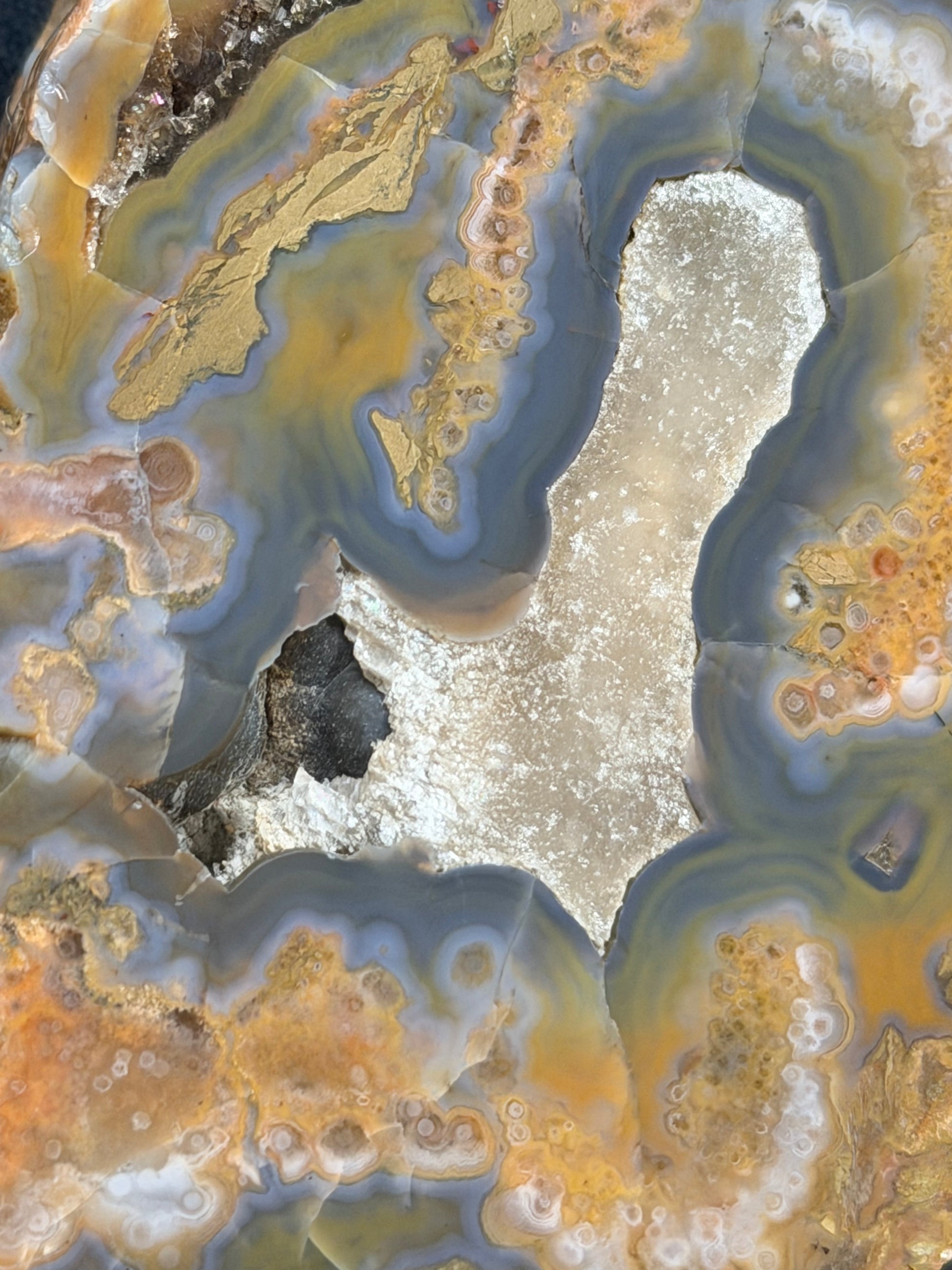 Look at all the little spheres in the Kentucky agate surrounding the calcite pocket! This is crazy enough right here. The mute blues and greens in the polished specimen are very calming.
