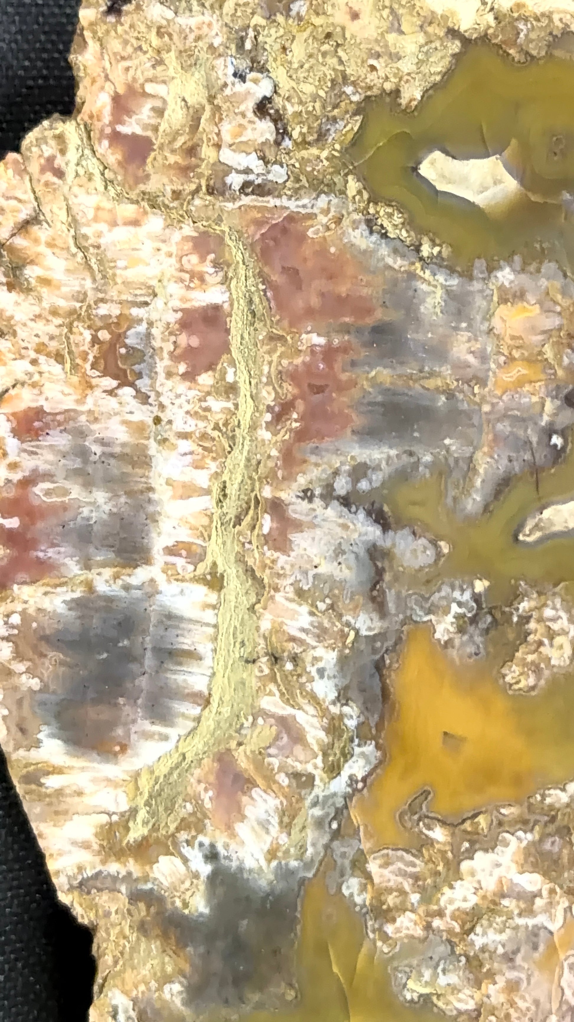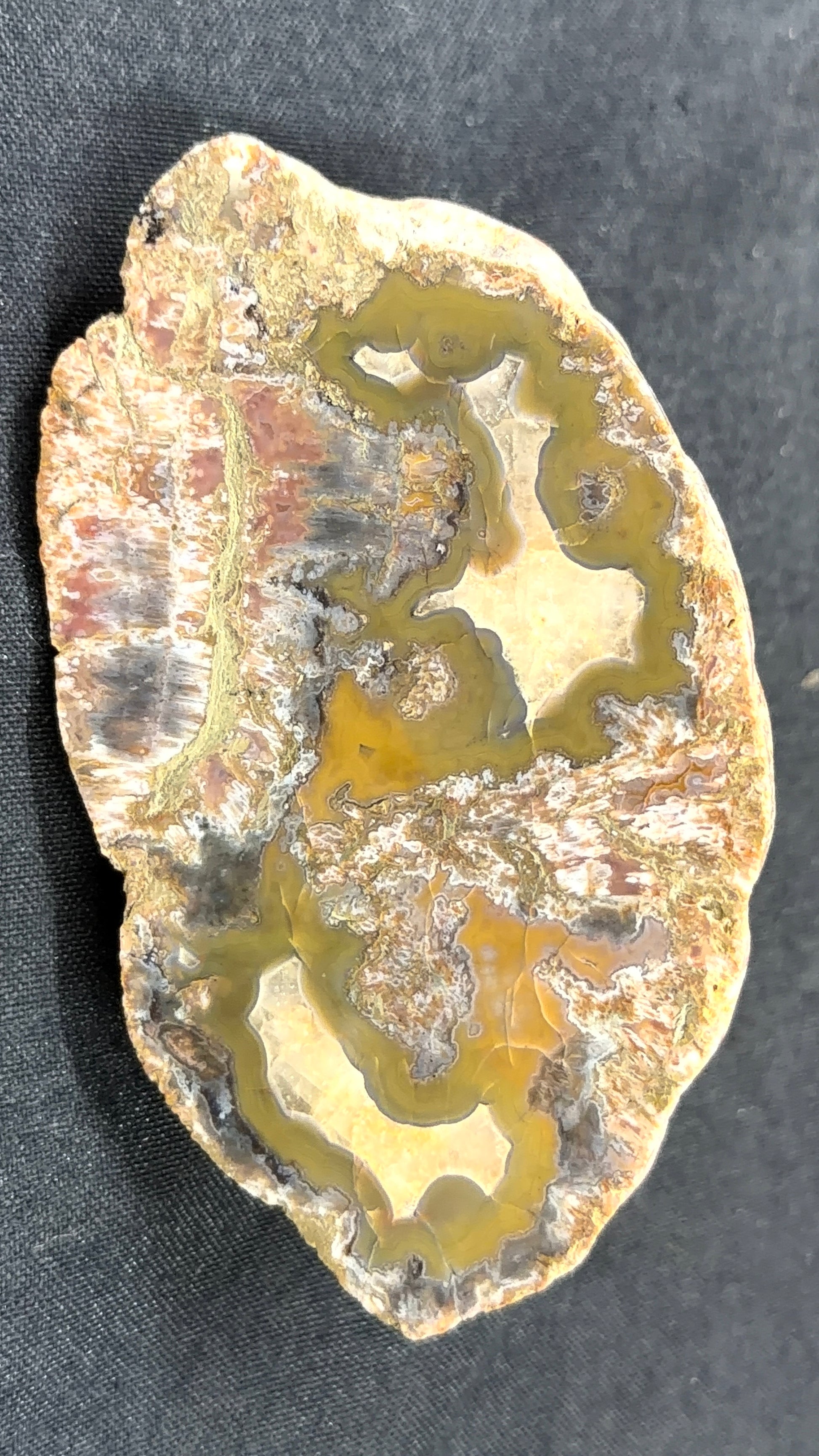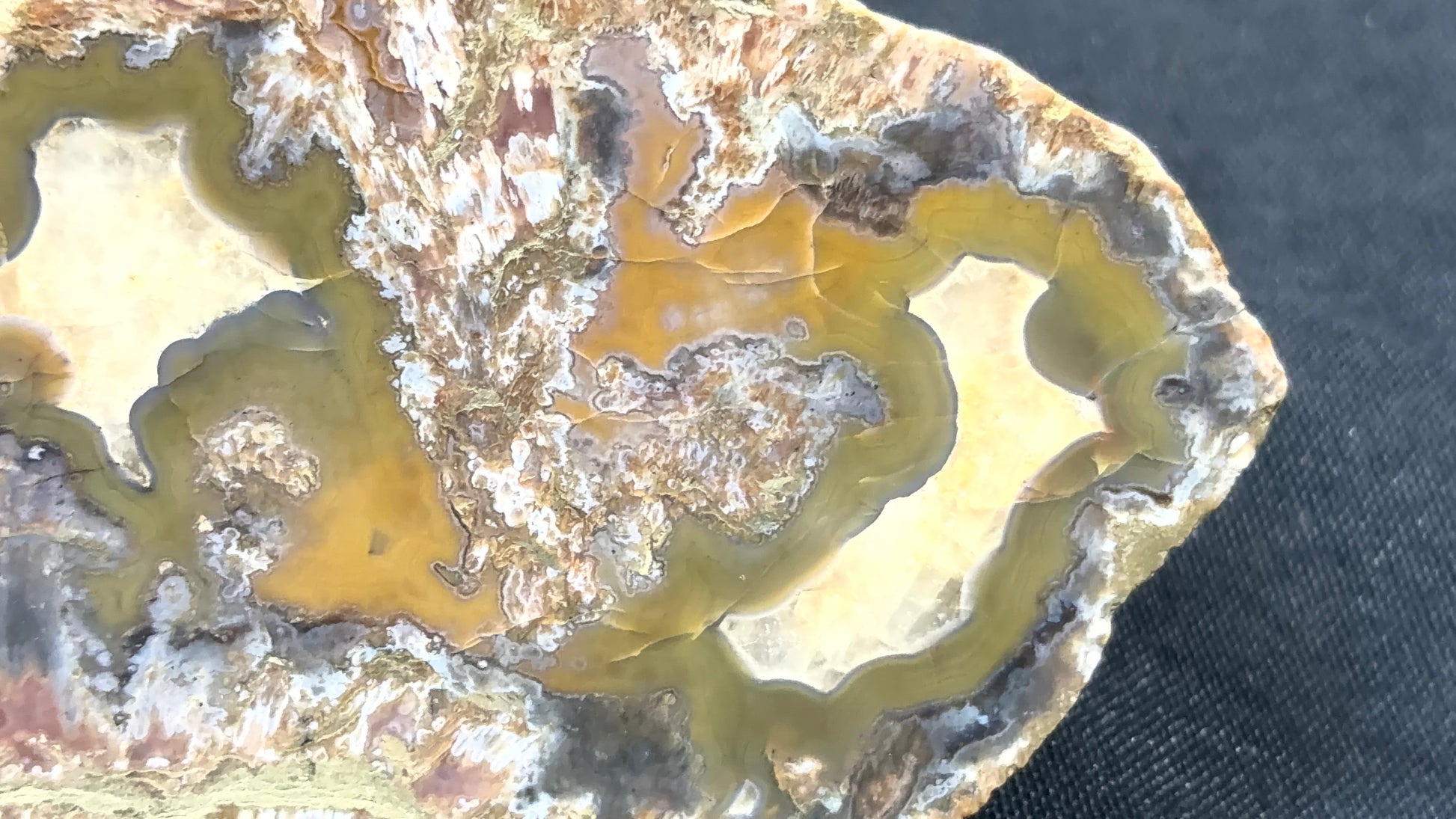 Yellow and greenish Kentucky Agate Dual bands with calcite center. The exteriors are some amazing looking moss agate